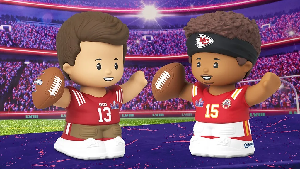 První Barbie NFL Super Bowl šampionky jsou plně oblečeny v fanouškovském vybavení týmů, včetně bublinkových bund, dresů a kšiltovek Super Bowl LVIII. Sady Fisher-Price Little People Collector Super Bowl obsahují tři figurky letošních NFL šampionů a také jednoho fanouška.