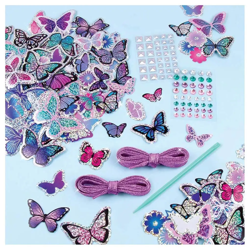 Vytvořte svůj vlastní módní trend, protože nyní můžete nosit své vlastní dekorované boty kdekoli. S pomocí Make It Real Sticker Chic můžete změnit vzhled svých bot. Začněte s bílou botou a oživte ji trendy vzory, barevnými tkaničkami a mnoha doplňky. Čerpejte inspiraci z motýlí sady Make It Real Sticker Chic a oživte své dny nejživějšími barvami a motivy. Je tu spousta šperků a motýlích nálepek, které mohou vaše boty zkrášlit a stát se atraktivnějšími, dokonce i vaše tkaničky mohou zářit krásnou fialovou barvou.