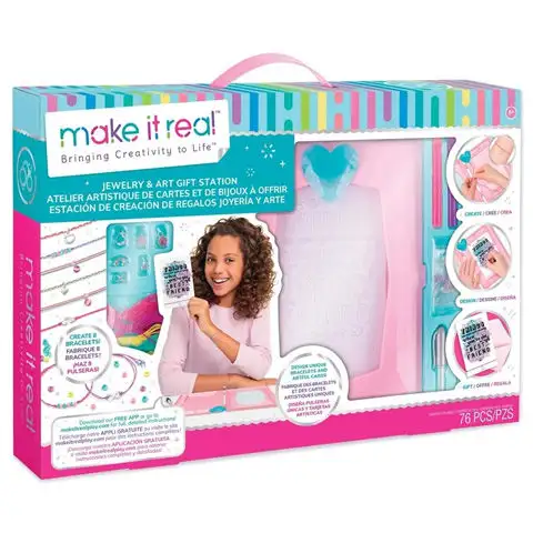 Hledáte pro své dítě speciální kreativní sadu, ve které může uplatnit svou kreativitu? Pořiďte mu tuto sadu Make It Real, která obsahuje vše potřebné pro výrobu několika šperků, a dokonce i pro tvorbu pohlednic nebo pozvánek. Sada obsahuje také plastový rám, který mu bude ve všem nápomocen. Kromě toho najdete v sadě barevné nitě, korálky, filcové tužky, pera, šablony písmen, obálky a prázdné listy, se kterými může tvorba začít.