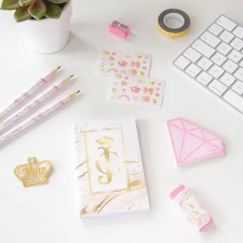 Vaše dítě se nyní může obohatit o tento opravdu oblíbený, luxusní psací set Juicy Couture Deluxe. Může vyzkoušet trendy barvy, jako je zářivé zlato, růžová a čistá bílá. Stylově navržený sešit s 120 linkovanými stránkami, tužka s grafitovými náhradními hroty a třemi gumami, zlatá lepicí páska, guma, ořezávátko, náplasti, sada samolepek a samolepící blok jsou všechno součástí sady. Kdo bude nejcool ve třídě? Může být také skvělým dárkem.
