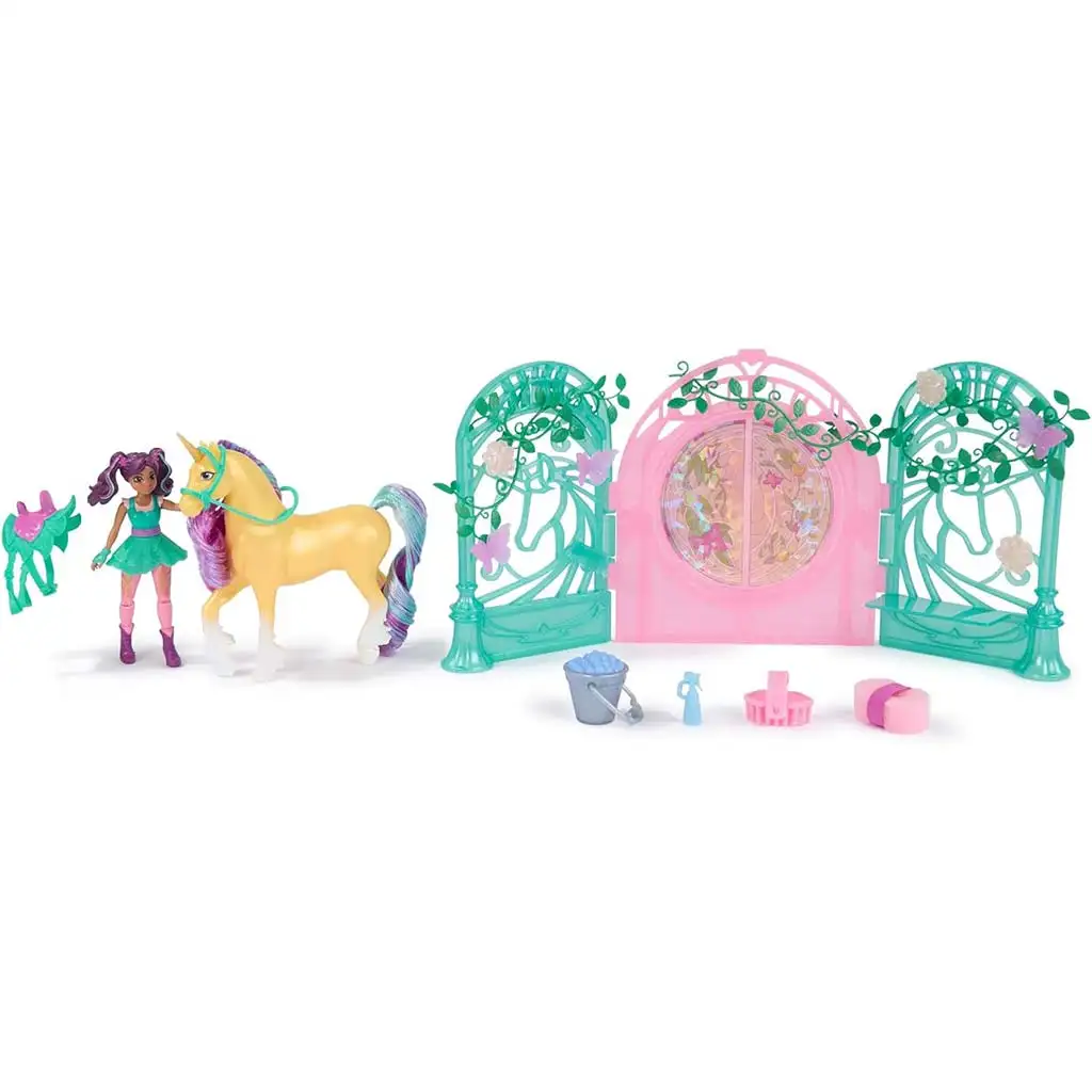 Mezi doplňky sady patří vrata stáje, květinové plotové části, pečovatelské pomůcky, krmné vědro, kartáč, rozprašovač a balík sena – vše, co malý hospodář potřebuje. Obě figurky, Ava i jednorožec, jsou pohyblivé, takže můžeš Avu skutečně posadit na Leafin hřbet a vyrazit na imaginární projížďku nebo trénink v akademii.