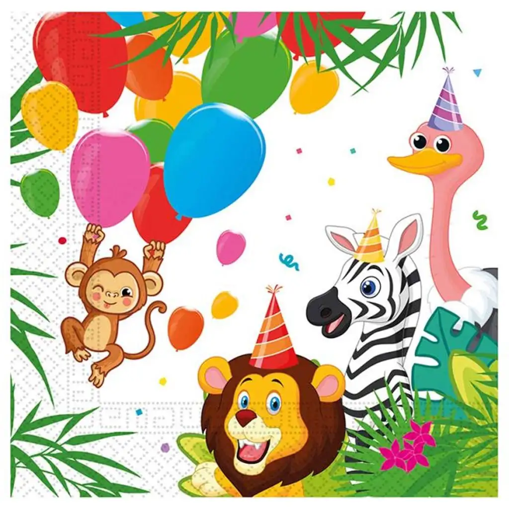 Vytvořte skutečnou džunglovou atmosféru na dětské oslavě s těmito barevnými a veselými papírovými ubrousky! Roztomilá opice, lev, zebra a pštros čekají v party čepicích, aby se malí hosté připojili k lesní zábavě. Mezi množstvím barevných balónků a zelených rostlin panuje opravdu veselá, hravá atmosféra – ideální volba pro narozeninovou džunglovou párty.