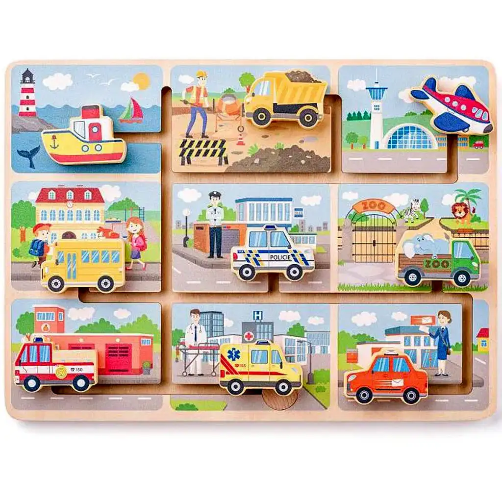 Vozidla v labyrintu je dřevěná hračka, která je ideální volbou, pokud chcete, aby vaše dítě při hře rozvíjelo jemnou motoriku a logické myšlení. V této barevné labyrintové hře mají děti za úkol přesunout různá vozidla – jako sanitku, policejní auto, školní autobus nebo letadlo – na správná místa ve městě, například ke škole, nemocnici nebo zoo. Během hry se naučí rozpoznávat vozidla a jejich funkce, což pomáhá poznávat svět.