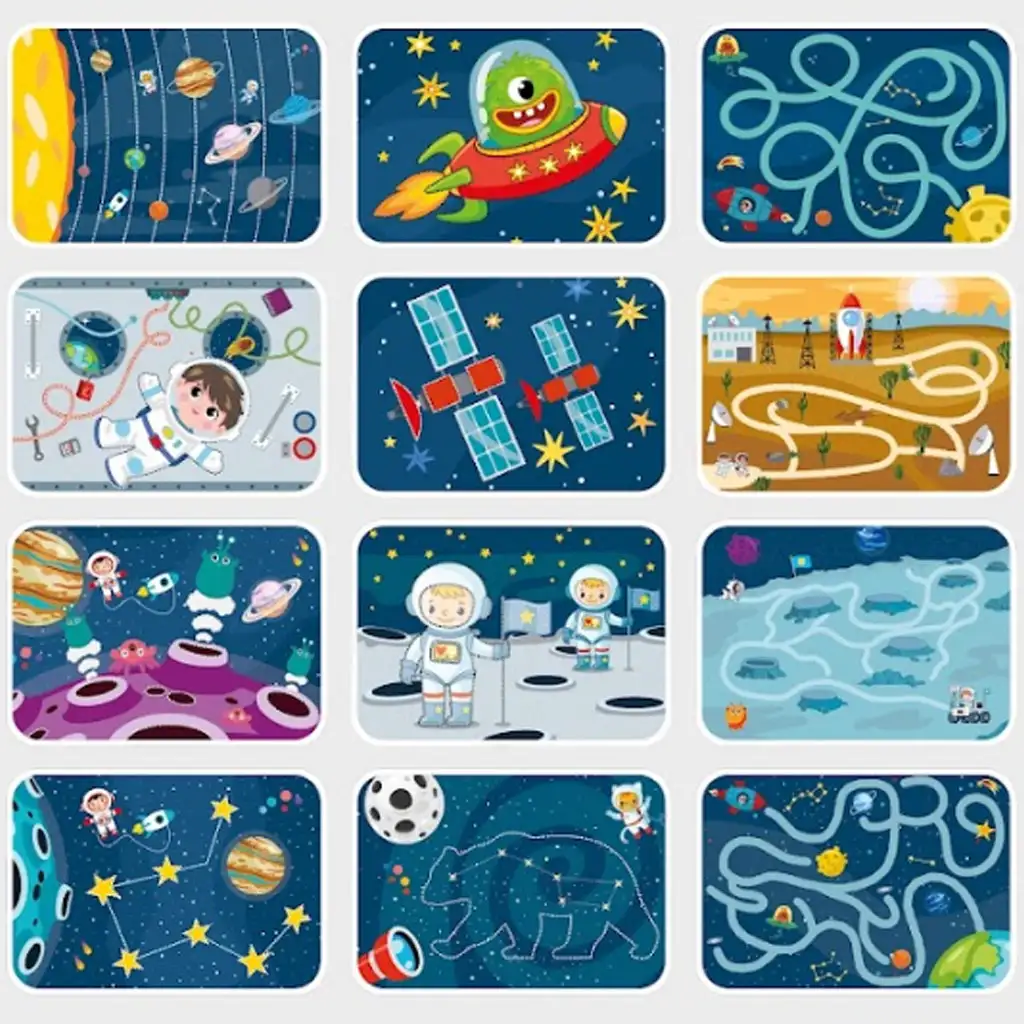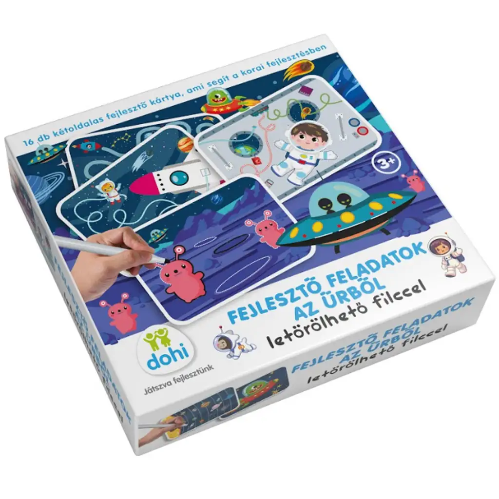 Balíček obsahuje 16 oboustranných karet plných různorodých úkolů, jako jsou bludiště, spojování bodů, cvičení vedení čar a doplňování vzorů. Díky mazatelnému fixu se děti mohou k úkolům vracet znovu a znovu, což zajišťuje dlouhodobé využití a nekonečnou herní zábavu. Veselé, vesmírně tematické ilustrace na kartách, jako jsou astronauti, mimozemšťané a rakety, zaručeně uchvátí dětskou fantazii.