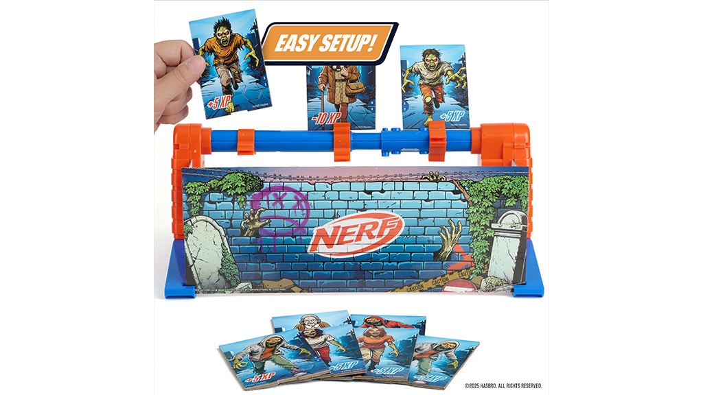 Poté musí pomocí NERF střel a vystřelovačů zasáhnout Zombie karty na otočném rámu, které se při zásahu snadno rozpadnou. Hra je tak jednoduchá, body lze rychle sledovat a je snadné začít znovu.