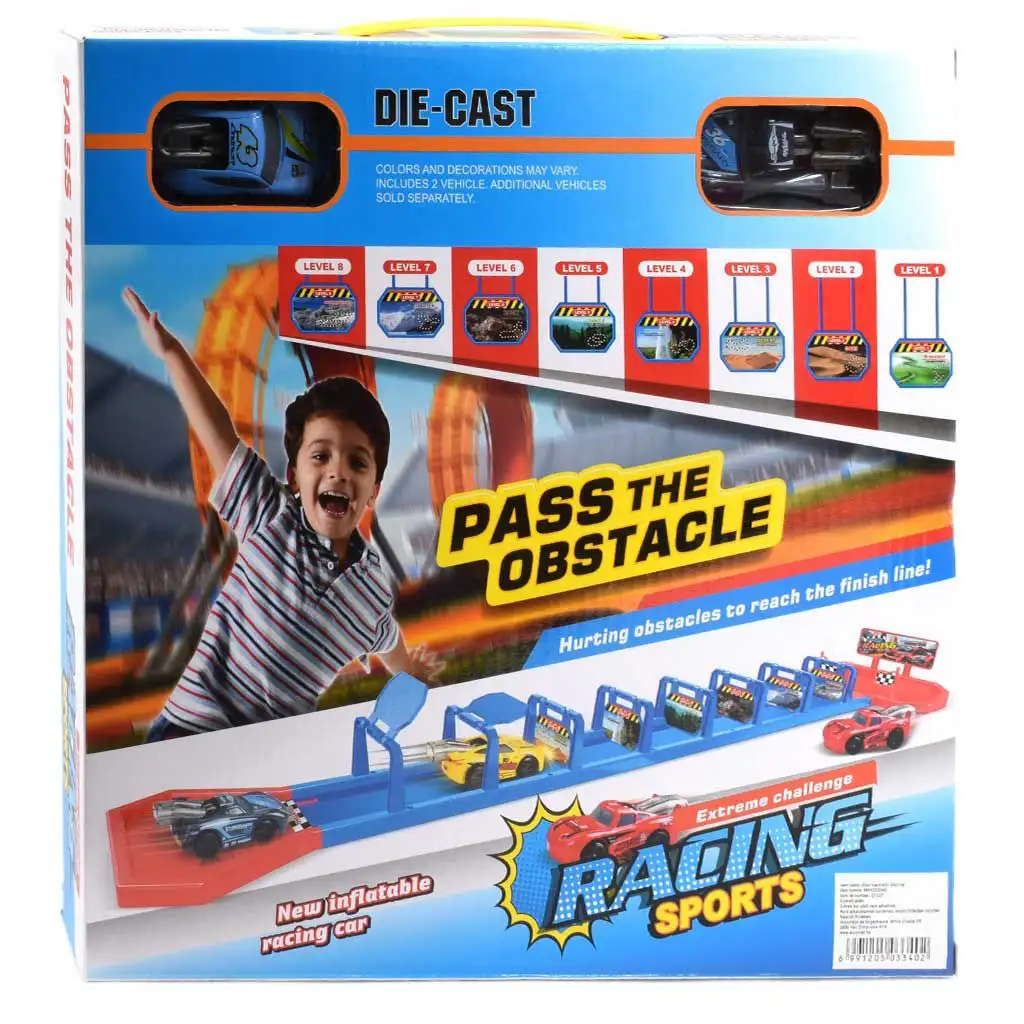 Připravte se na zvýšení adrenalinu s Racing Sports: Extreme Challenge akceleračním závodním setem! Tento vzrušující set je plný rychlosti a překážek, které jistě vyzkouší vaše závodnické schopnosti. Uvolněte radost z jízdy na této úchvatné dráze, kterou jsme pro vás připravili s dvěma rychlými a vzrušujícími autíčky! Při stavbě závodní dráhy jsme se snažili o detailní zpracování, takže prvky dráhy přesně zapadají do sebe a autíčka pohybují realisticky. Překážky skrývají vzrušující výzvy a pouze nejšikovnější závodníci je dokážou překonat. Set obsahuje všechny potřebné doplňky, aby byl závod ještě vzrušující a dobrodružný. Dvě autíčka, které set obsahuje, jsou různých barev a stylů, takže si každý závodník může vybrat auto, které mu nejlépe vyhovuje. Tyto rychlé vozy mají vynikající přilnavost, takže snadno zvládnou zatáčky a překážky na dráze.