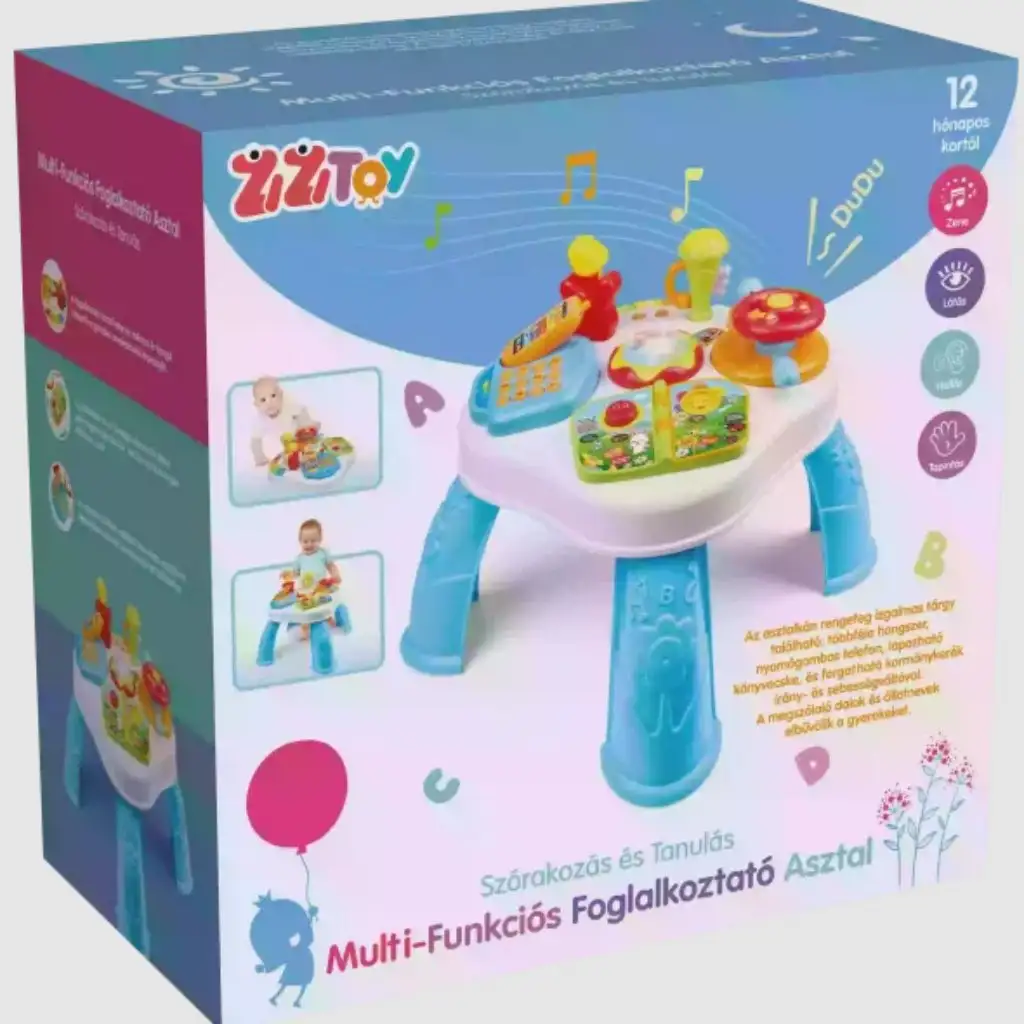 ZiziToy Multifunkční zábavní stůl je ideální volbou pro malé děti, které se při hře učí a objevují svět. Interaktivní stolek mluví maďarsky, takže pomáhá seznámit děti se zvuky, melodiemi a mnoha vzrušujícími prvky. Děti na něm najdou hudební nástroje, tlačítkový telefon, listovací knížku a otočný volant s řadicí pákou. Stisknutím různých tlačítek hračka přehrává různé zvuky a melodie, které nejen baví, ale také rozvíjejí děti.