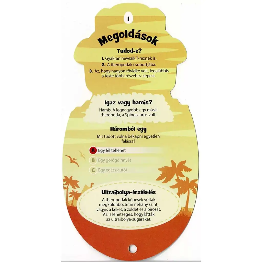 Kartičky obsahují tři typy otázek: bleskové otázky, pravda-nepravda a tří možností, takže si děti při hraní rozvíjejí znalosti, logické myšlení i úsudek. Víte například, jak velké sousto dokázal spolknout T-Rex jedním kousnutím? Nebo který dinosaurus byl největší dravec? Na zadní straně karet najdou nejen správné odpovědi, ale také další zajímavosti – každá karta je tak malým objevem navíc!