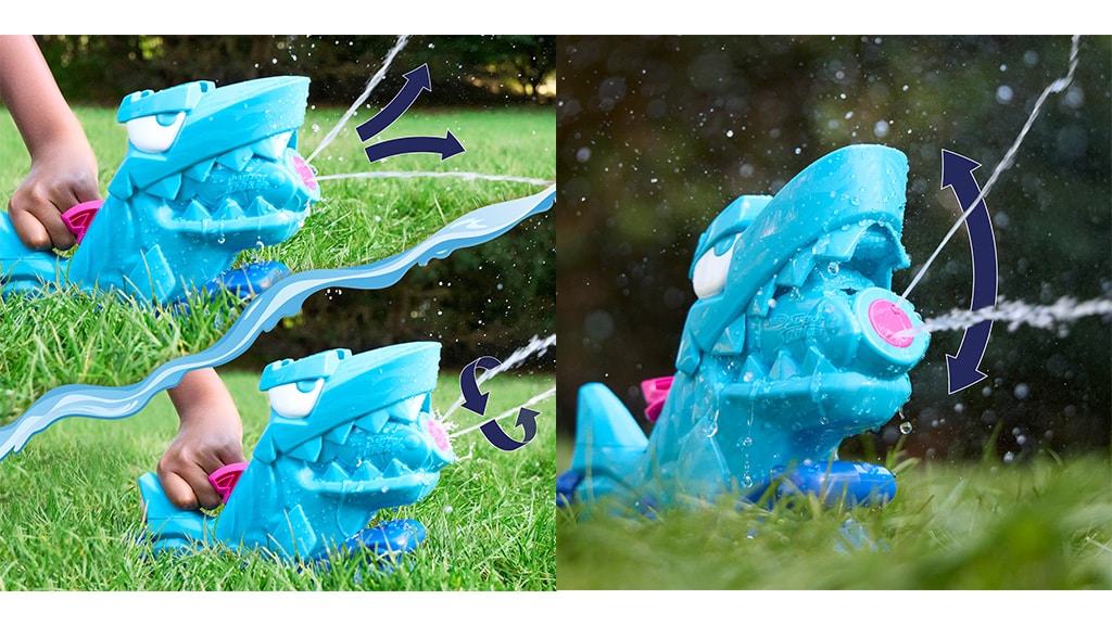A NERF Super Soaker Hop & Chomp je fantastická vodní hračka pro děti od 3 let. Zvláštností této hračky je, že má zavlažovací hlavici ve tvaru žraloka, která vystřeluje dva proudy vody z čelistí a přitom provádí kousací pohyby, takže vodní sprška vždy přijde překvapivě. Pomocí přepínače lze také měnit směr vodních proudů, takže proudy vody se začnou otáčet a směr zavlažování lze upravit.
