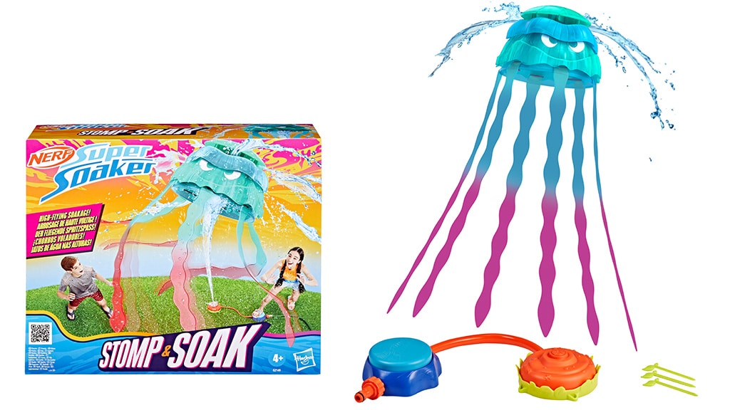 Super Soaker Stomp & Soak je speciálně navržen pro děti od 4 let. Hračka obsahuje medúzu, kterou lze pomocí odpalovací podložky vystřelit do vzduchu, a z vrcholu zvonu medúzy stříkají proudy vody. Chapadla medúzy také stříkají vodu do všech směrů, což dělá hru ještě zábavnější. Stačí připojit odpalovací podložku k funkční zahradní hadici a Super Soaker Stomp & Soak se postará o zábavu! Tato hračka je perfektní volbou pro letní vodní bitvy a zaručeně oživí každou zahradní párty nebo rodinné setkání.