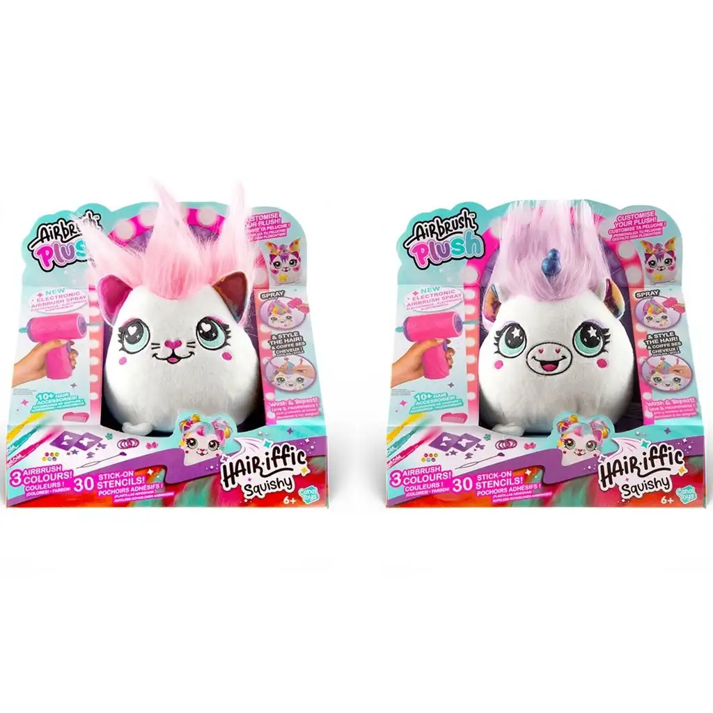 Uvolněte svou kreativitu s super měkkými Airbrush Plush Hairiffic Squishy plyšáky! Tito roztomilí malí tvorové – kočka a jednorožec – se nemohou dočkat, až od vás dostanou barvu a jedinečný styl. Hra spočívá v tom, že děti mohou samy zdobit, barvit a znovu a znovu přetvářet své malé plyšové kamarády pomocí elektrické airbrush pistole.