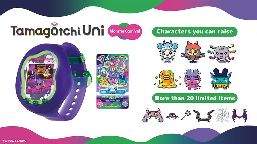 Sbírka obsahuje dva nástroje, z nichž každý dodává jedinečnou atmosféru zážitku s virtuálním mazlíčkem. Angel Festival přináší roztomilou atmosféru s růžovou stuhou a pastelovými barvami. Monster Carnival ví, jak to rozjet s odvážným a punkovým designem, který obsahuje tmavě fialové a neonově zelené barvy.Kdo se chystá na párty? Každé zařízení obsahuje vstupenku na exkluzivní událost v Tamaverse. Fanoušci mohou využít své vstupenky k výchově, setkávání a hraní s exkluzivními postavami a k používání speciálních předmětů s motivy andělů a monster. Tato událost nabízí fanouškům jedinečnou příležitost ponořit se hlouběji do světa Tamaverse a zažít jedinečné zážitky. Nezmeškejte tuto fantastickou příležitost stát se součástí tohoto jedinečného dobrodružství!