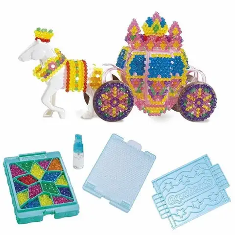 Aqua Beads je zcela nová a jedinečná kreativní hra, díky které mohou děti vytvářet opravdu speciální výtvory, zejména s pomocí tohoto balení. V krabici najdete vše potřebné, aby se s trochou času a zručnosti mohl vytvořit působivý, skutečně trojrozměrný kočár. Tento třpytivý kočár má otáčející se kola a může být zapřažen nádherný kůň. Originální japonská hra, ve které mohou děti vytvářet vlastní výtvory z korálků, a jakmile je obraz hotov, stačí korálky postříkat vodou a začnou se spojovat a během několika hodin je fantastický korálkový vzor zcela fixován.