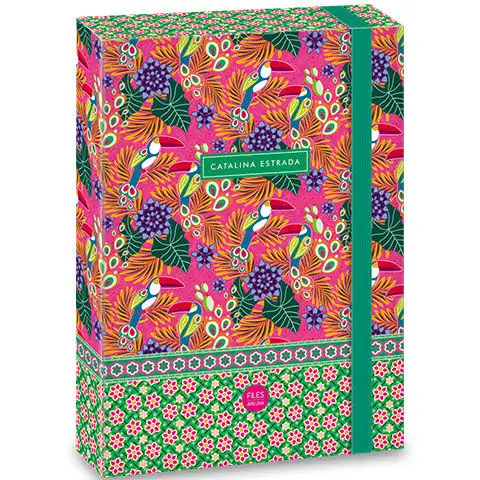 Vzory Cataline Estrada jsou samy o sobě velmi nápadné, zejména tento kus zdobený tropickými ptáky a rostlinami. Sešitová krabice s harmonickými barvami a vzorem mandaly je stejně nápadná, jak je užitečná, takže ji děti budou rádi používat. Sešitová krabice je vyrobena z tlustého tvrdého kartonu a je doplněna o složkový design s sedmimilimetrovým širokým, silným gumovým páskem, který upevňuje víko. Do této sešitové krabice lze uložit sešity, listy a knihy až do formátu A4.