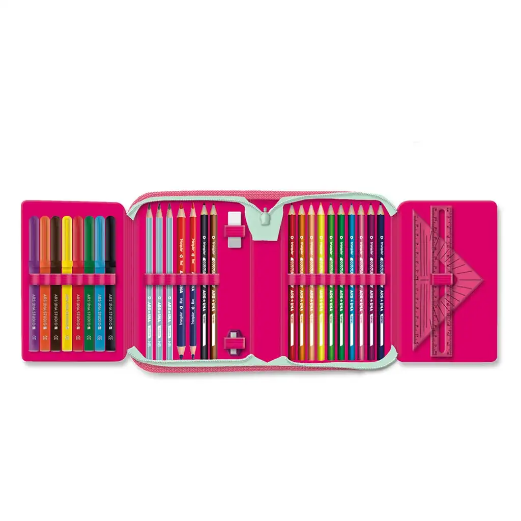 Díky zipovému uzavírání je obsah penálu snadno přístupný a nabízí kompletní vybavení: barevné tužky, fixy, grafitové tužky, gumu, ořezávátko a pravítka – vše pečlivě uspořádané, aby se v nich vaše dítě snadno vyznalo.