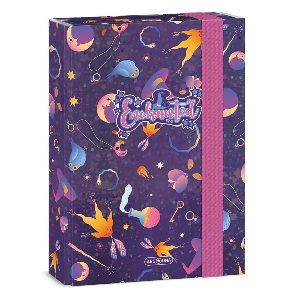 Kouzelný zážitek čeká ve světě papírenského zboží s tímto okouzlujícím A5 velikosti sešitovým boxem, který obsahuje všechny prvky mystické noční oblohy. Vzor zdobený hvězdami a měsíci, stejně jako roztomilé, fantazijní dívky, otevírá bránu do zvláštního, magického vesmíru. Fialová základní barva je hluboká a uklidňující, zatímco růžový hřbet dodává moderní, trendy kontrast. Tento sešitový box je perfektní volbou pro ty, kteří mají rádi pohádkové, magické doplňky a přinášejí trochu třpytu do svých každodenních školních aktivit. Jeho odolnost a praktická gumička zajišťují, že vaše poznámky zůstanou uspořádané a v bezpečí.