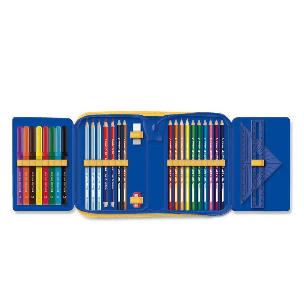 V penálu najdete 12 trojúhelníkových barevných tužek, které pomáhají s kreativním vyjádřením a kreslením. Dále obsahuje 3 kusy HB grafitových tužek, které jsou ideální pro kreslení a poznámky. Sada tužek zahrnuje také tenké a tlusté propisky, které jsou skvělé pro psaní a barvení. 8 barevných fixů pak nabízí další možnosti pro výrazné kreslení a malování.