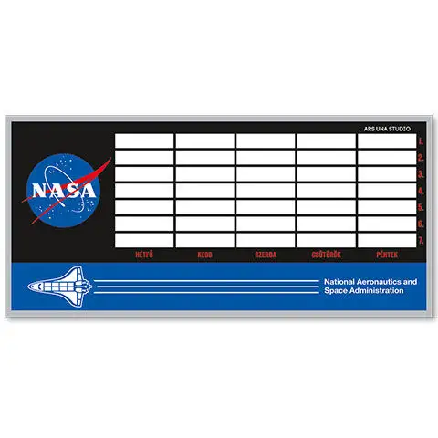 Tento rozvrh hodin ozdobený logem NASA a raketoplánem zaujme především malého chlapce, který touží stát se astronautem, a zároveň mu pomůže si uvědomit, na kterou hodinu se musí připravit. Rozvrh hodin od Ars Una je jednostranný, ale má dvoustrannou úpravu, takže na něm můžete označit týdny A a B. Rozvrh je v maďarštině, vyrobený z 250g pololesklého ofsetového papíru, který má nádherné barvy a můžete na něj psát perem i tužkou. Rozvrh se vejde do většiny penálů, takže ho budete mít vždy po ruce a na očích.