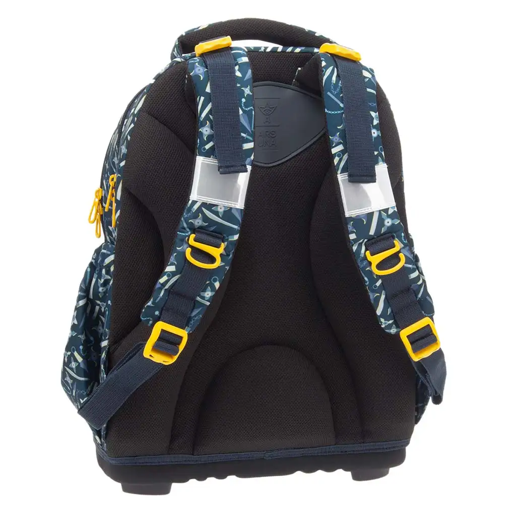 Batoh váží pouze 0,9 kg, takže je vhodný pro děti a snadno se nosí. Tři prostorné přihrádky na zip pomáhají s organizací věcí: největší z nich má textilní přepážku, v nejmenší nechybí našitý držák na psací potřeby a kapsa na průkazky. Po obou stranách jsou pružné kapsy vhodné na láhev nebo drobnosti. Spodní část je z odolné textilie, kterou chrání 4 plastové nožky před poškozením, reflexní prvky pak zvyšují bezpečnost ve tmě.