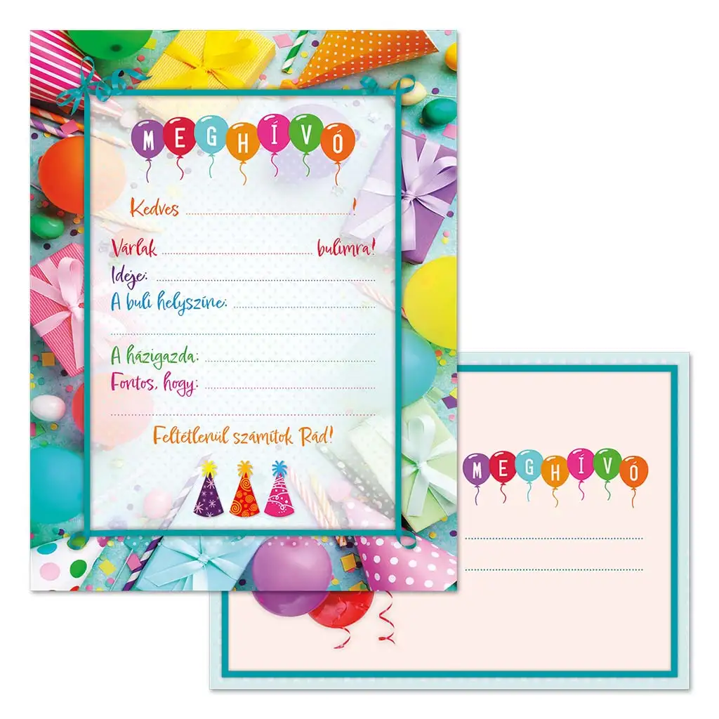Toto balonkové pozvání na oslavu s obálkou – sada 10 kusů – je perfektní volbou, pokud vaše dítě pořádá narozeninovou oslavu a chcete, aby i samotné pozvání bylo opravdu výjimečné. Veselá, barevná grafika s balonky a dárky navodí slavnostní atmosféru už na první pohled a praktická vyplňovací pole pomáhají zaznamenat všechny důležité informace – datum, místo konání, hostitel i speciální poznámky se sem snadno vejdou.