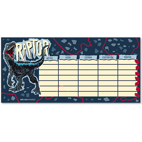Filmy Jurský park a Jurský svět sklidily obrovský úspěch, a od té doby děti dinosaury ještě více zbožňují, takže tento raptorový rozvrh se jistě stane ceněným kouskem v penálu. Rozvrh Ars Una je tvořen jedním listem, ale je oboustranný, takže na něm můžeš označit týden A i B. Rozvrh je v maďarštině, vyrobený z pololesklého křídového papíru 250 g; jeho barvy jsou nádherné a můžeš na něj psát propiskou i tužkou. Rozvrh se vejde do většiny penálů, takže bude vždy po ruce a na očích.