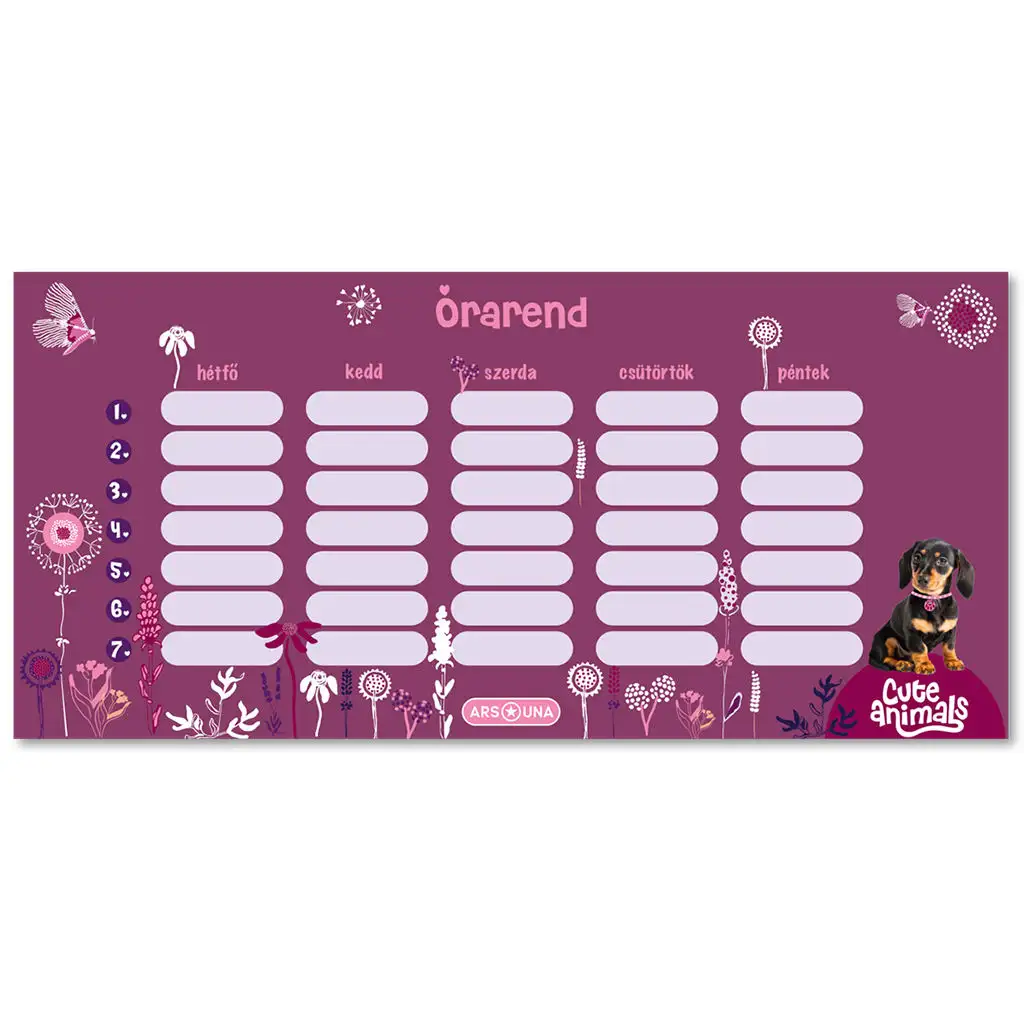 Poznejte rozvrh Ars Una Cute Animals - Puppy s jezevčíkem, který bude opravdu milým a stylovým doplňkem pro každou milovnici psů. Tento rozvrh s fialovým podkladem a vzorem jezevčíka a květin je nejen praktický, ale také roztomilý a veselý, což je atmosféra, kterou byste chtěli mít kolem sebe každý den.