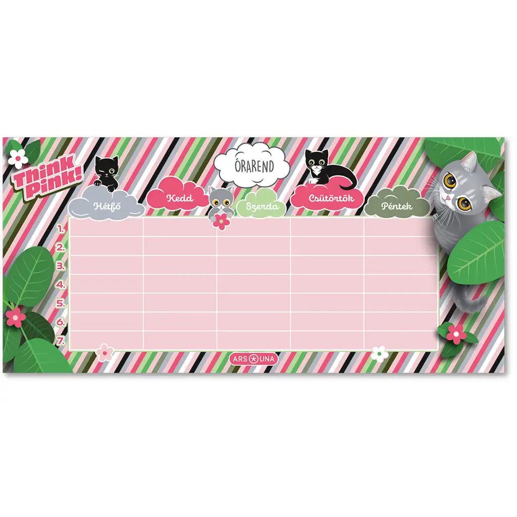 Pokud vaše dítě miluje kočičky a má rádo veselé, barevné vzory, s rozvrhem hodin Ars Una Think Pink určitě s radostí zahájí nový týden! Tento jednostránkový, oboustranný rozvrh je ideální volbou pro mladší i starší dívky, které chtějí, aby jejich školní potřeby odrážely jedinečný styl.