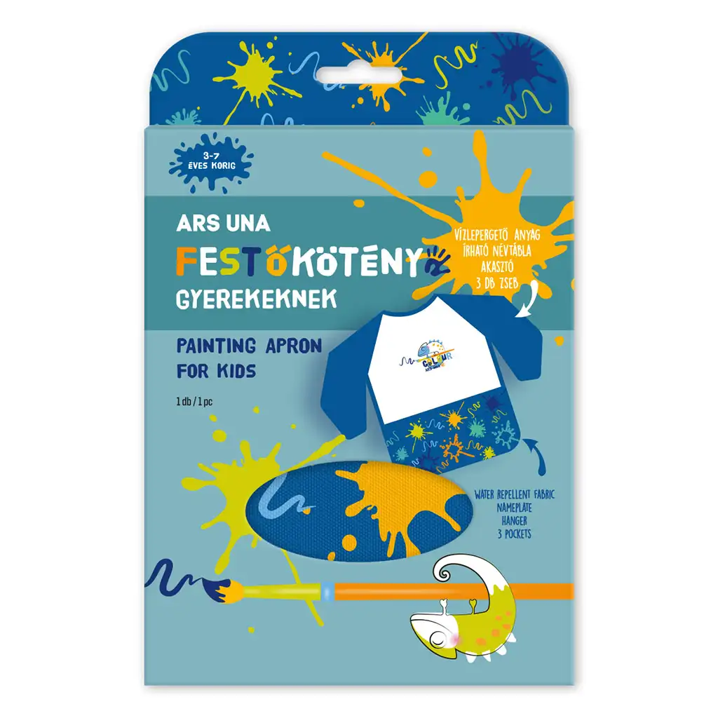 Blue Splash malířská zástěra s dlouhými rukávy je ideální volbou pro všechny kreativní děti, které milují malování, kreslení nebo tvoření! Tato zástěra z vodoodpudivého materiálu chrání oblečení před barvou, lepidlem a jinými nečistotami, takže vaše dítě může svobodně tvořit, aniž byste se museli obávat skvrn. Dlouhé rukávy poskytují ještě větší ochranu a tři kapsy ve spodní části zástěry jsou perfektní na štětce, tužky nebo malé poklady. Díky poutku na krku ji lze snadno pověsit a psací jmenovka zaručí, že se ve školce nebo škole nikdy neztratí. Veselá modrá základní barva, barevné cákance a malý chameleon dodávají tvoření ještě větší zábavu!
