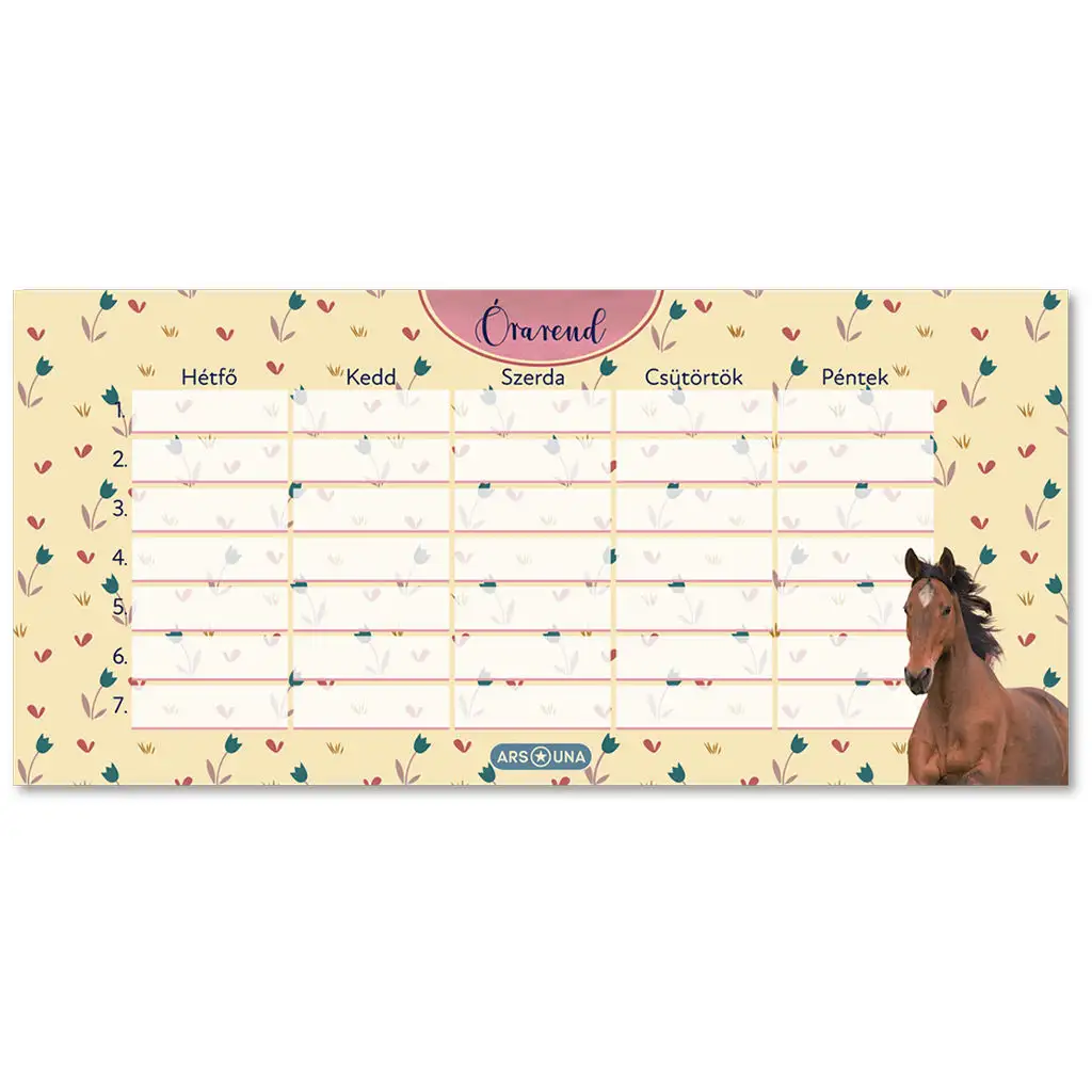 Poznejte rozvrh hodin Ars Una Wild and Free s koňmi, který je krásným a stylovým doplňkem pro každou dívku, která miluje koně a přírodu. Tento rozvrh hodin je zdoben květinovým a koňským motivem na světle žlutém pozadí, takže je nejen praktický, ale také inspirativní a přináší přírodní atmosféru, jako byste se procházeli po louce plné volně pasoucích se koní a květin.