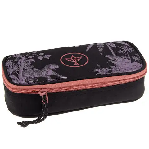 Penál s tropickým vzorem džungle na černém podkladu a broskvově barevným zipem, který svému majiteli může propůjčit opravdu stylový vzhled během školních dnů. Díky 100% polyesterovému materiálu je velmi odolný a má vodoodpudivý efekt, takže se snadno nezašpiní a je snadno čistitelný. Délka penálu 21 cm umožňuje pohodlně uložit pravítko nebo kružítko spolu s dalšími psacími potřebami.