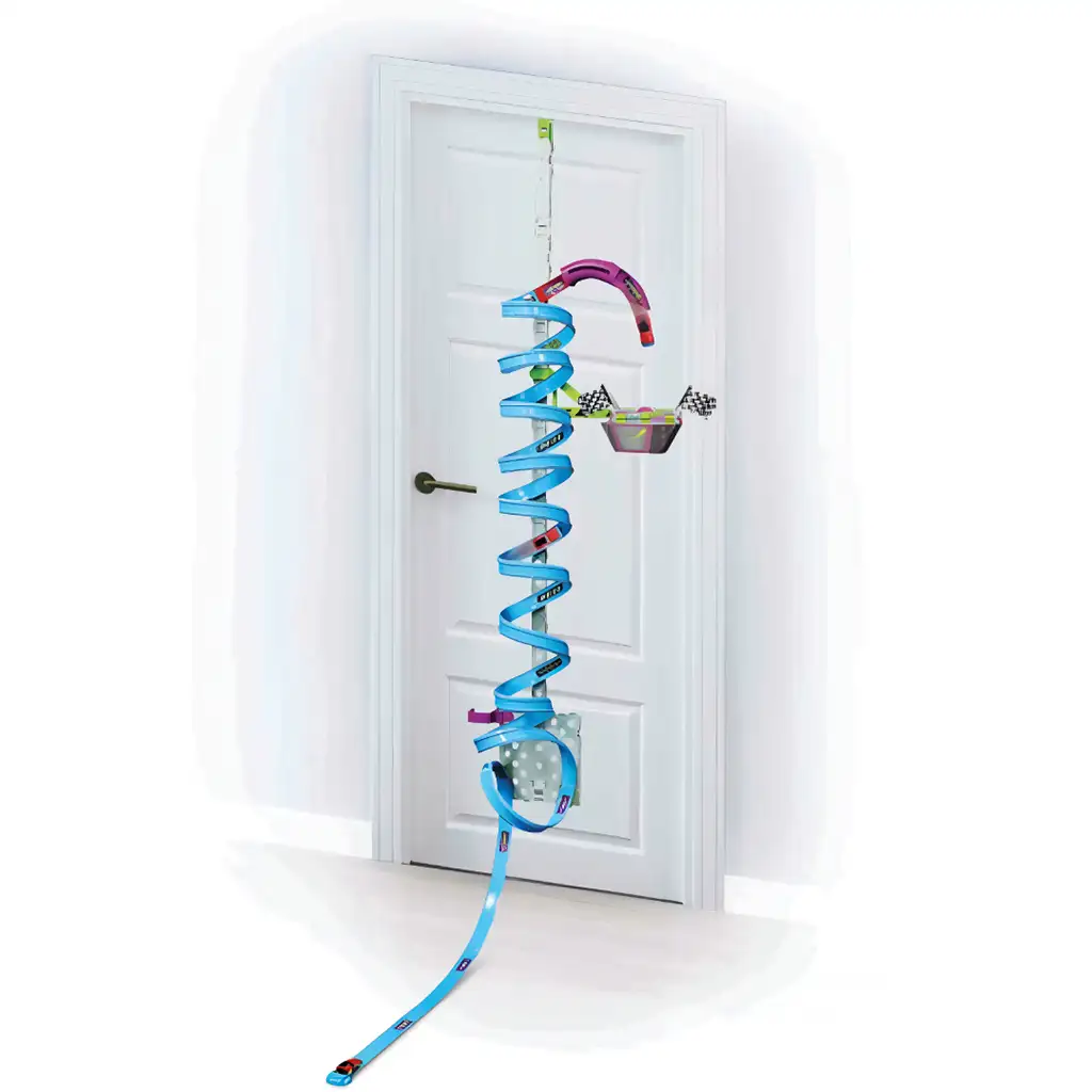 Dráha se snadno připevní na vrchol dveří a odtud vede až k podlaze. Díky speciálnímu gravitačnímu systému není potřeba motorový pohon ani baterie, takže děti mohou vozidlo znovu a znovu spouštět, aby dosáhlo cíle s úžasnou rychlostí a dynamikou.