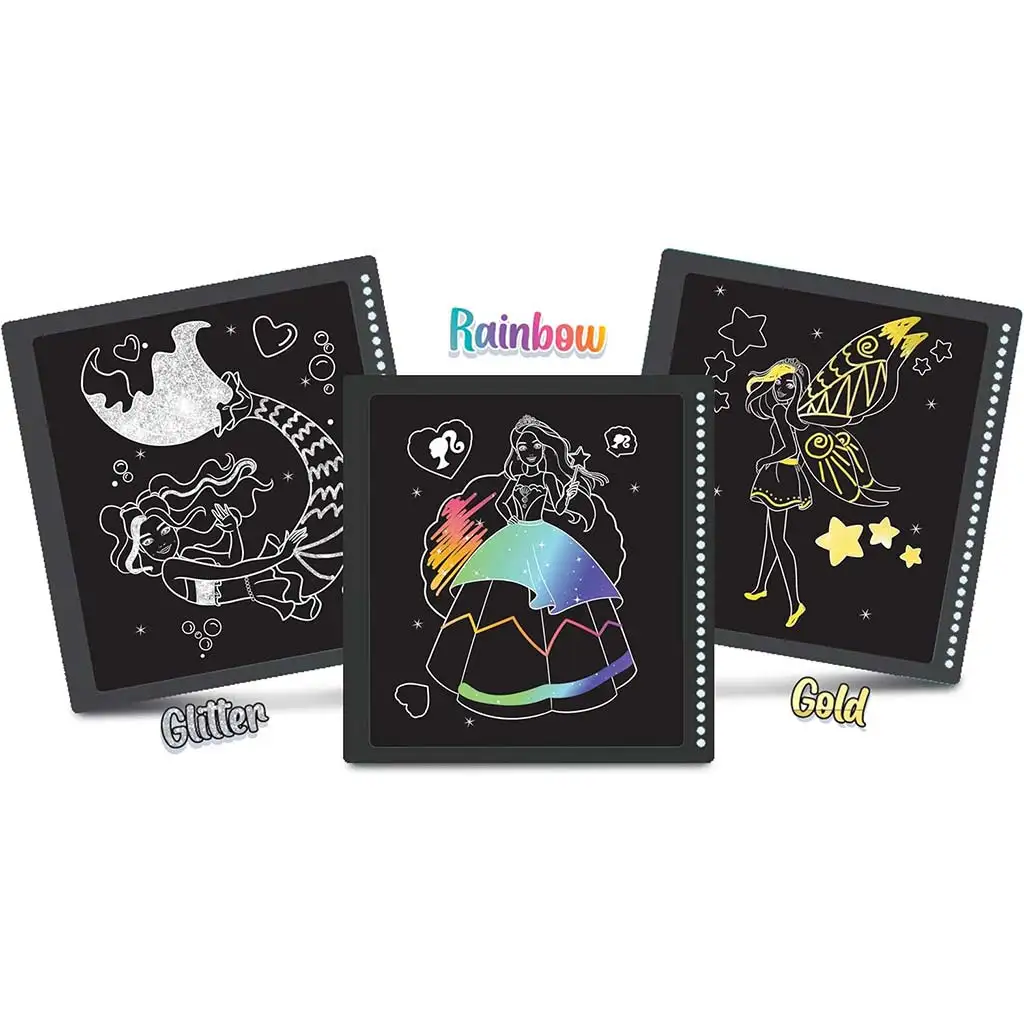 Barbie Mer-Mazing škrábací kreativní sada je snem každého malého dítěte, které miluje tvoření, třpytky a samozřejmě Barbie! Tento 44stránkový spirálově vázaný škrábací blok je plný překvapení s mořskou tématikou, kde mořské panny, jednorožci, víly a princezny čekají, až ožijí pod rukama dětí. Černé listy se škrábou speciálním plastovým nástrojem, díky čemuž se při každém tahu objeví kouzelné barvy – například zlatá, třpytivá nebo duhová.