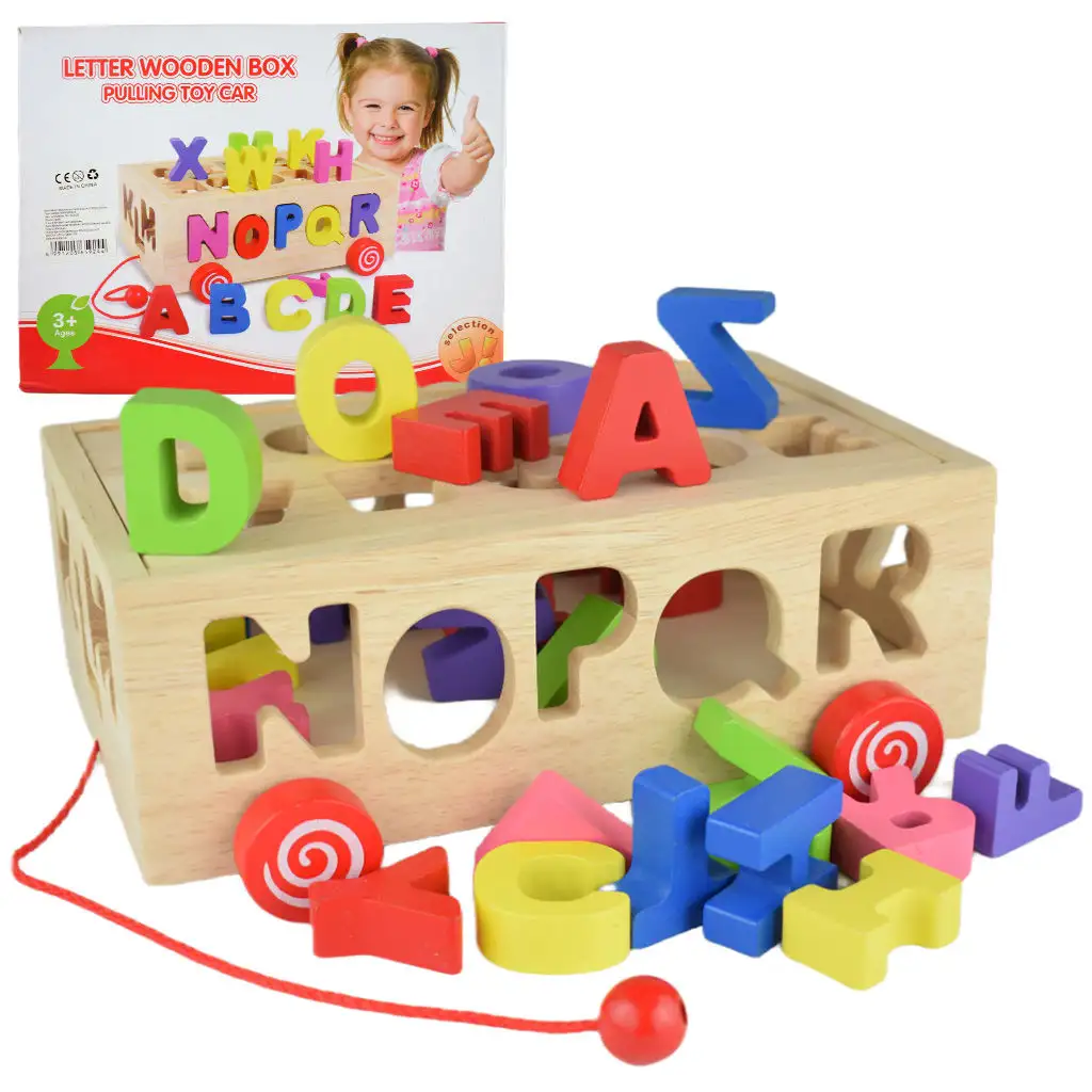 Beilaluna: Dřevěný tvarový sorter s písmeny na odtahovém vozíku
