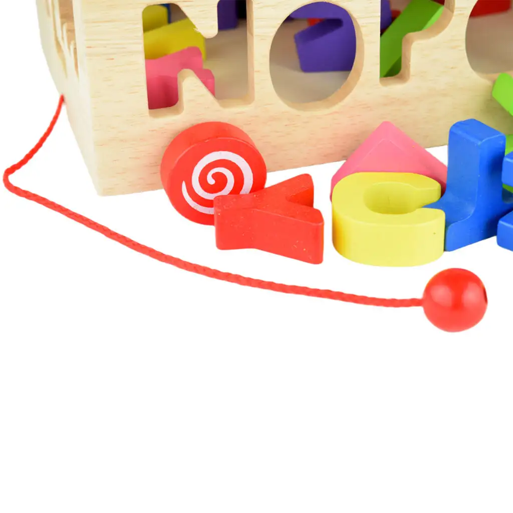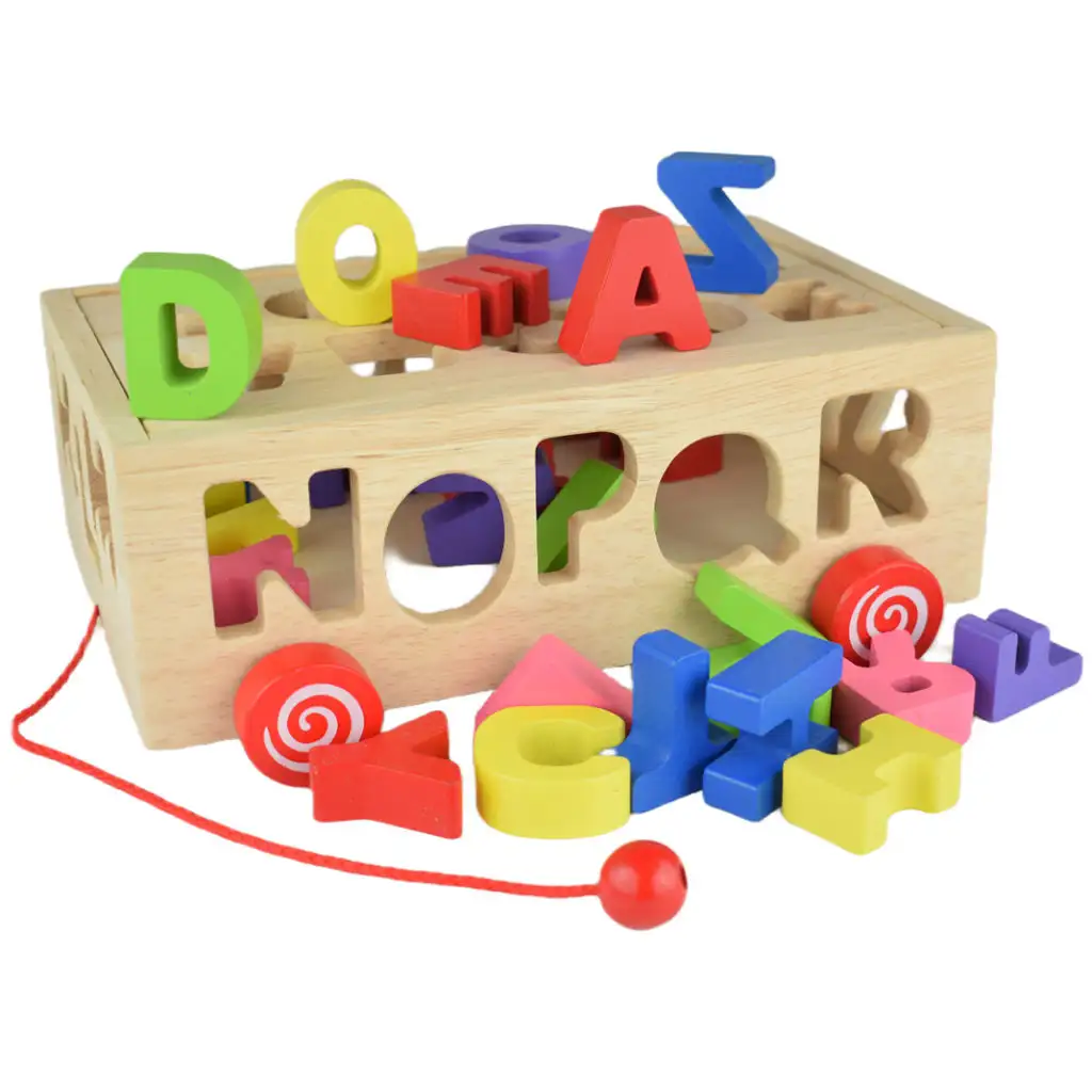 Beilaluna: Dřevěný tvarový sorter s písmeny na odtahovém vozíkuBeilaluna: Dřevěný tvarový sorter s písmeny na odtahovém vozíku