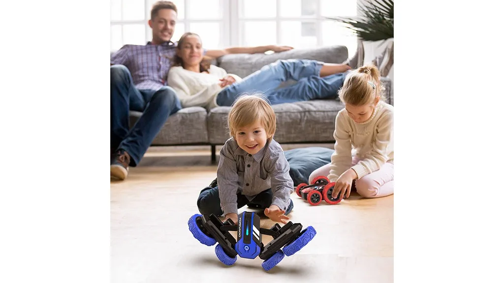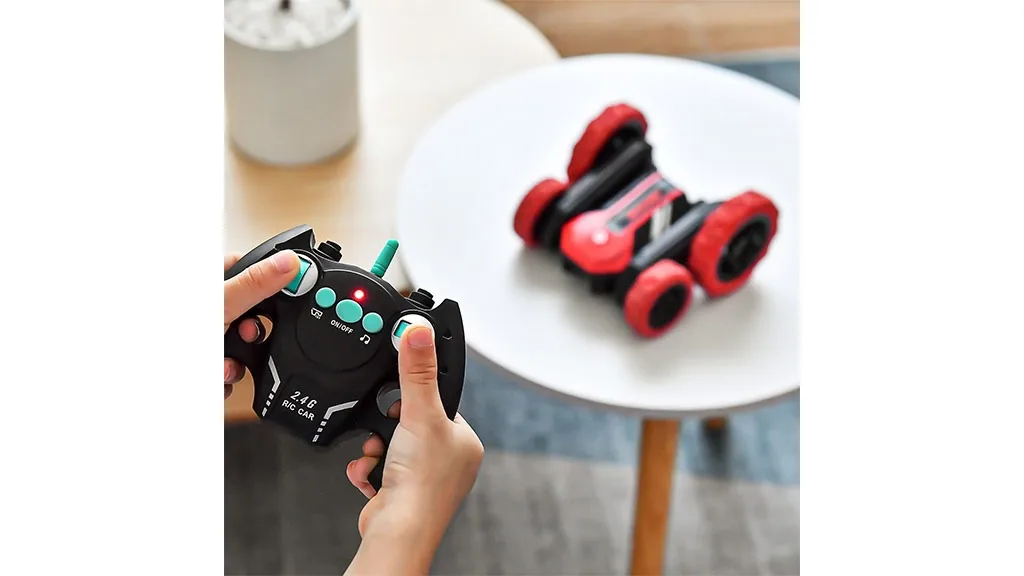 RC Stunt Car, které je určeno pro děti od 6 let a starší, je navrženo pro akci. Kola vozidla jsou velká, takže může jezdit i když je obrácené vzhůru nohama. Navíc má speciální zadní nápravu, která roztáhne kola, což je ideální pro otáčení. Na dálkovém ovladači je také další tlačítko, které aktivuje režim Tornádo, kde se RC Stunt Car otáčí na předních kolech, zatímco zadní kola jsou ve vzduchu. K dispozici jsou tři různé rychlosti otáčení pro různé úrovně epické zábavy.