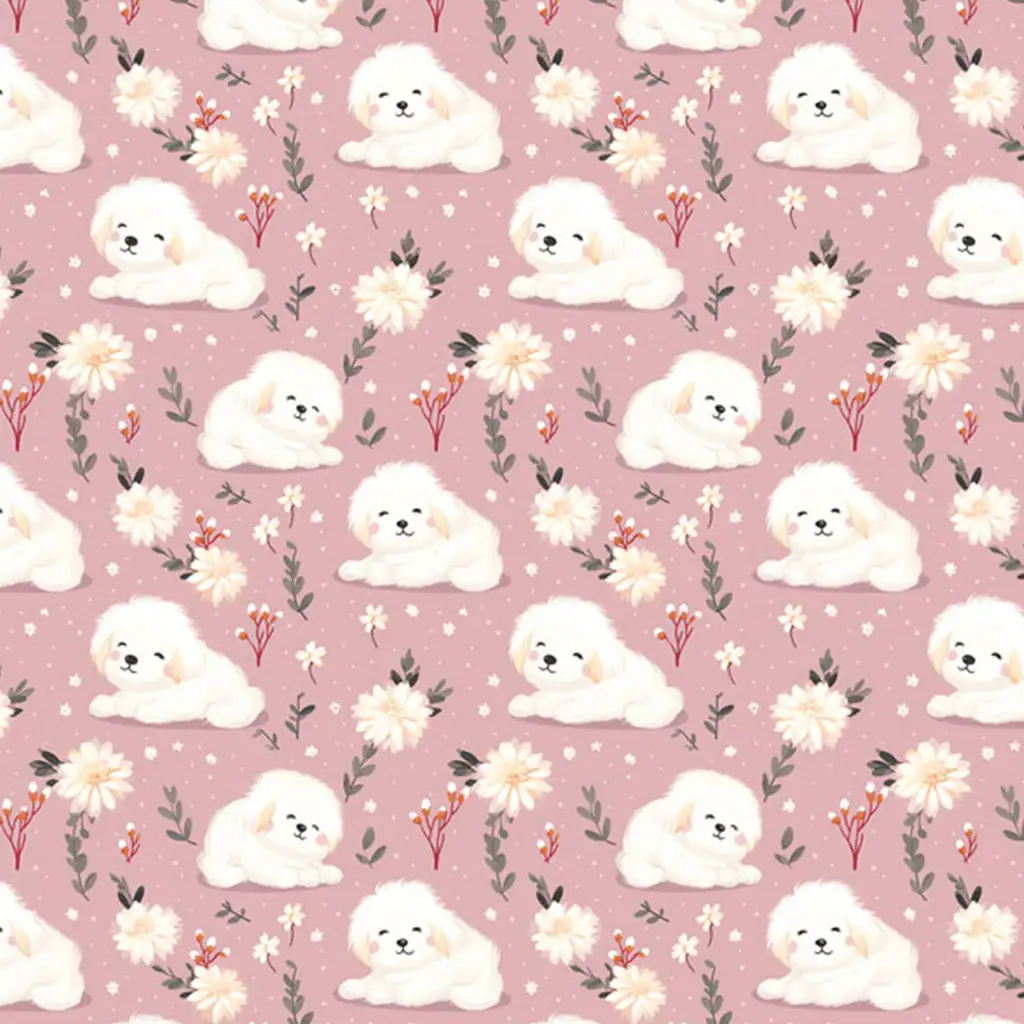 Motiv: bílá štěňátka s květinami na růžovém podkladu