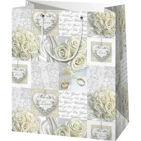 Můžete získat vynikající dárkovou tašku s lesklým povrchem, která má vzor bílých květin a je ideální pro balení svatebních dárků. Dárková taška má pevné uchopovací rukojeti, které usnadňují přepravu dárku a jeho předání oslavenci.