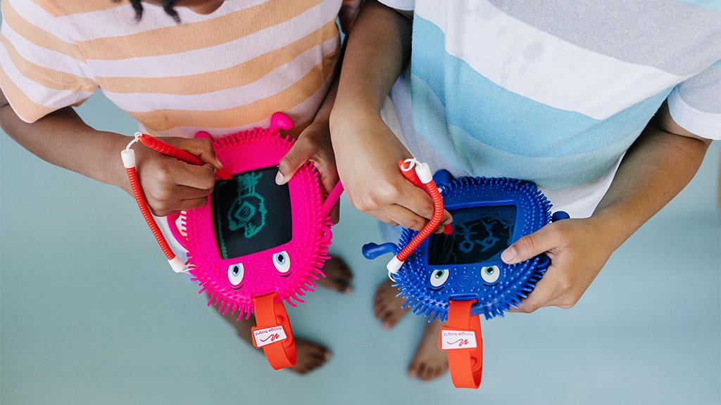 Tyto zábavné kreslicí tabulky Boogie Board, známé jako Squiggle (růžová) a Spike (modrá), jsou skvělými smyslovými společníky, které pomáhají soustředit a uvolnit úzkostné mysli a neklidné ruce. S texturovanou obrazovkou a silikonovým pouzdrem mohou děti kreslit a psát na obrazovku cokoliv a jedním stisknutím tlačítka to vymazat. Silikonový klip lze snadno připevnit na batohy, obědové tašky a mnoho dalšího, takže malý přítel může být vždy po ruce!