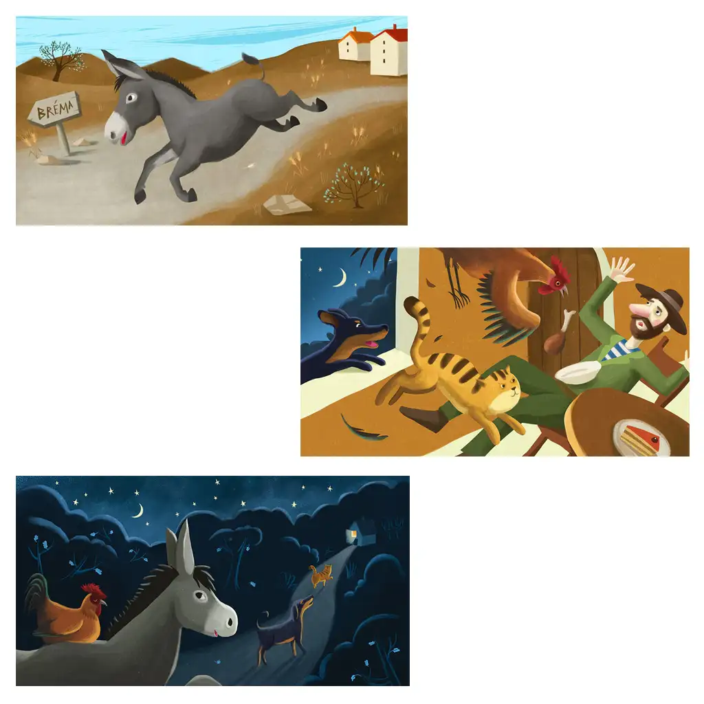 Objevte znovu tento pohádkový příběh díky kreativním dílům Ildi Horváth a nechte ikonické postavy ožít s kresbami Brémských muzikantů!