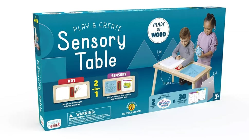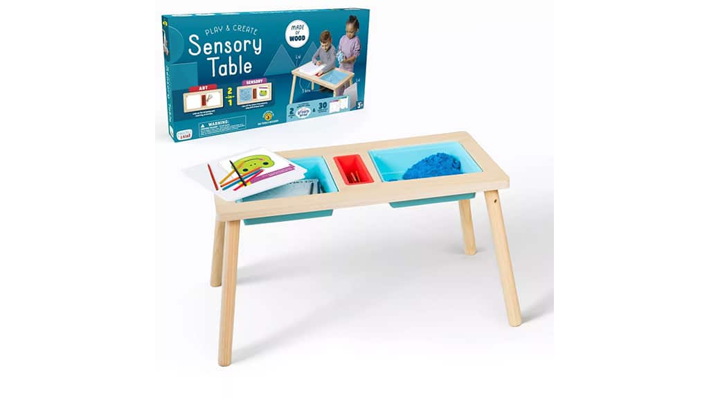 Stůl Buffalo Games Play & Create Sensor je dvou v jednom, dřevěný stůl přizpůsobený velikosti dětí, který má tři úložné prostory pro hraní a ukládání. Stůl obsahuje Dream Sand, což je uklidňující, měkký, kinetický písek, tři suché stíratelné fixy a 30 vzdělávacích aktivit pro zábavu bez nepořádku. Stůl Play & Create Sensor je určen pro děti od 3 let.