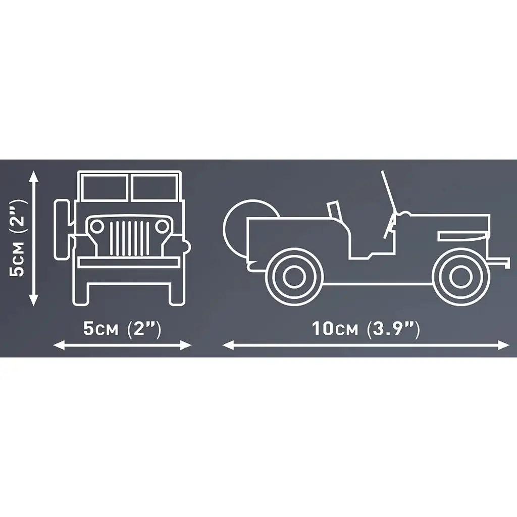 Sada obsahuje 111 kvalitních dílů COBI. S pomocí speciálních dílů reprodukuje charakteristické rysy Jeepu – konvexní kapotu motoru, typickou mřížku chladiče, zaoblené blatníky a klasické kulaté světlomety. Model má otáčecí kola a je kompatibilní s COBI minifigurkami, takže z něj může být nejen dekorace, ale i hračka.