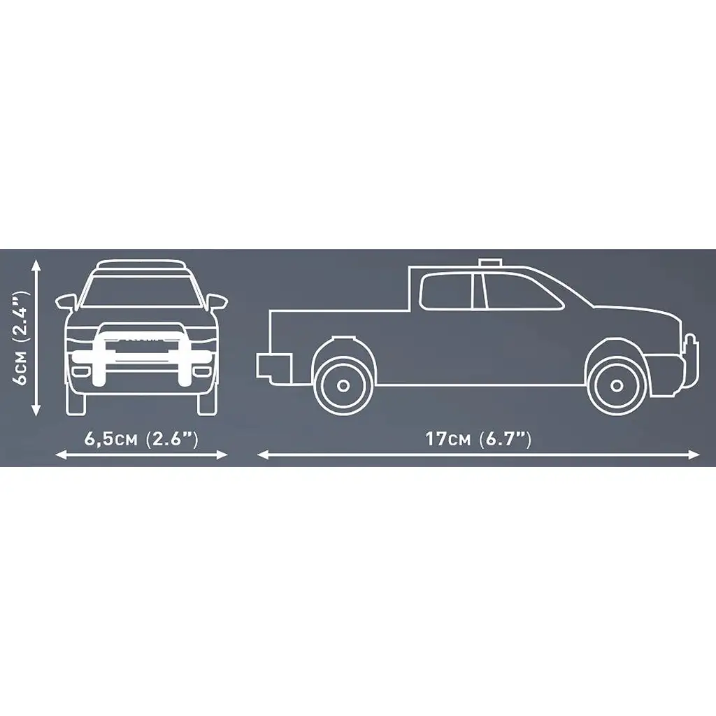 Stavebnice COBI Dodge RAM 1500 policejní auto představuje ikonický americký pick-up v policejním provedení. Model v měřítku 1:35 je složen z 203 dílků a věrně zobrazuje robustní tvary originálního vozidla. Černobílé barevné provedení, maják a policejní označení dodávají modelu speciální vzhled. Gumové, otočné kola zajišťují realistický zážitek ze hry a potištěné dekorace jsou odolné, takže nejsou potřeba žádné samolepky. Hotový model je stabilní a masivní, proto skvěle vypadá i ve vitríně sbírky.