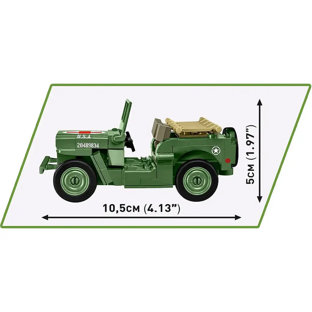 Jeep Willys MB se právem stal legendou – pro svou jednoduchost, spolehlivost a schopnost pohybu v náročném terénu byl na frontových liniích nepostradatelný. Ve stavebnici COBI si můžete postavit jeho věrnou repliku, historickou přesnost podtrhují kvalitní potisky, které se neošoupou, nepoškrábou a neblednou ani při hraní. Nosítka, která lze upevnit na zadní část vozu, nabízejí jedinečný herní zážitek, a s figurkou lékaře si děti mohou vymýšlet vlastní záchranné akce.