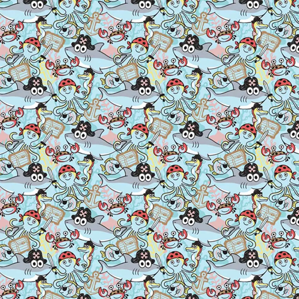 Překvapte ty nejmenší balením, které navozuje atmosféru opravdového mořského dobrodružství! Dárkový balicí papír „Pirátské mořské dobrodružství“ o rozměrech 100x70 cm je ideální volbou na dětské dárky, protože každý jeho centimetr je plný vzrušujících detailů: usmívající se chobotnice s mečem a pirátskou čepicí, žraloci s páskou přes oko, malé krabi, kotvy, mořští hadi, truhly s pokladem a mnoho dalších veselých mořských postaviček tančí na světle modrém pozadí.