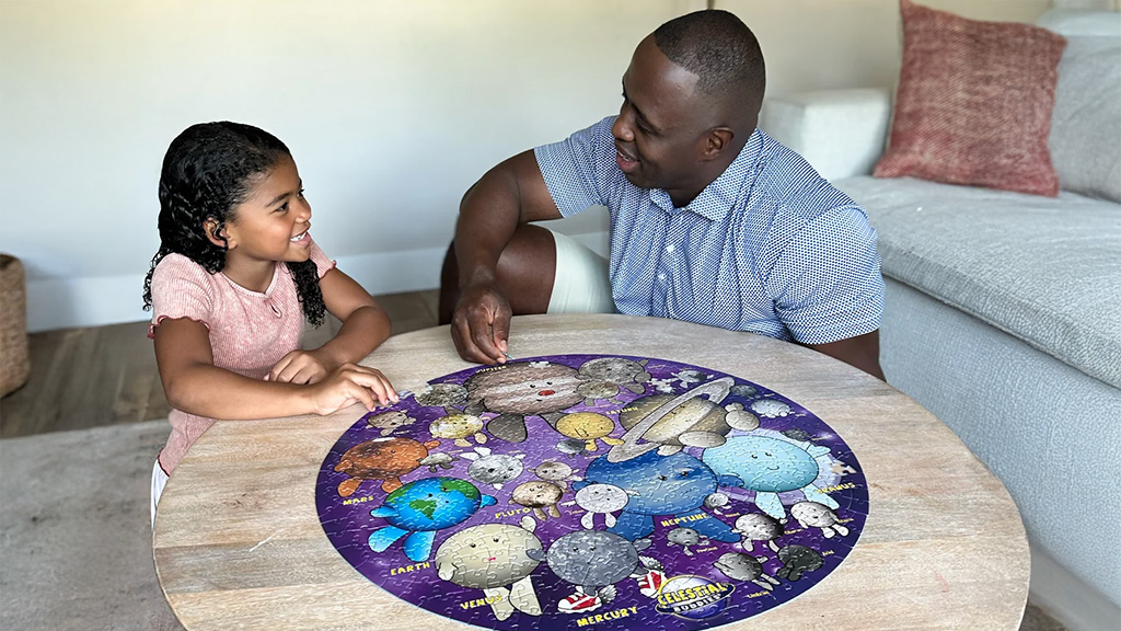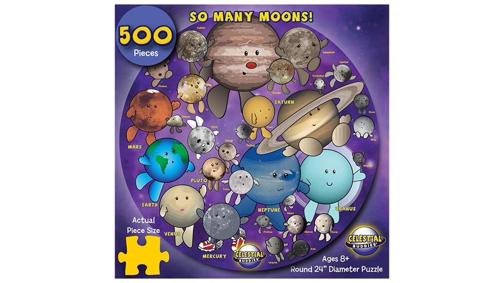 Tato skládačka kombinuje zábavné ilustrace s výukovými výhodami. Přiložený průvodce učí děti o planetách naší sluneční soustavy a jejich doprovodných měsících. Když děti dokončí sestavení skládačky, průvodce se promění v oboustranný plakát, který si mohou pověsit ve svém pokoji. Stavění skládaček může pomoci dětem rozvíjet dovednosti jako řešení problémů, trpělivost a kritické myšlení. Kromě toho skládání nabízí rodinám skvělou příležitost strávit společně kvalitní čas, zatímco se děti hravou formou učí o vesmíru.