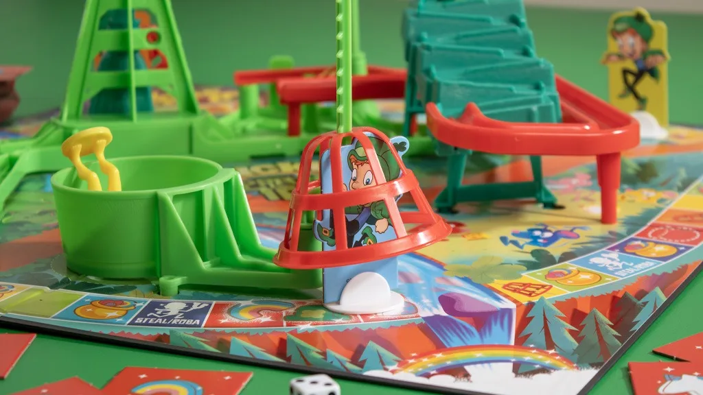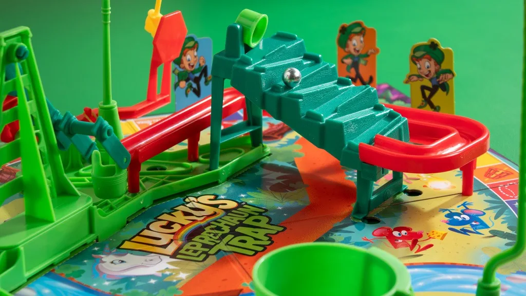 Uchop maskota Lucky Charms v nové edici hry Mouse Trap! Deska a karty zobrazují Luckyho a marshmallows známé z obilovin.