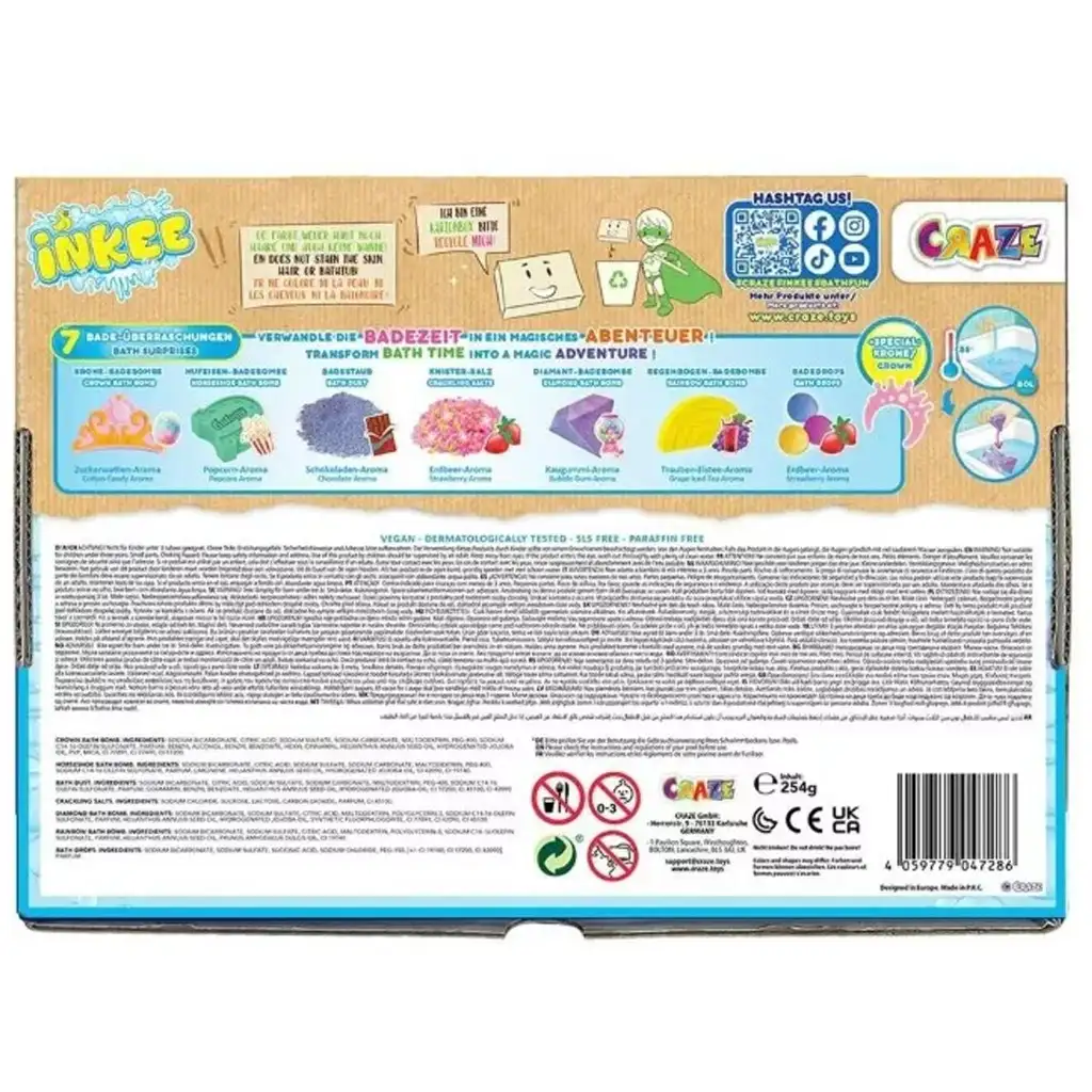 V balení najdete 7 různých koupelových překvapení, včetně koupelové bomby s vůní cukrovinek, praskající koupelové soli s jahodovou příchutí, ovocných koupelových perel, duhové koupelové placky a mnoho dalšího! Každý kousek se svým jedinečným tvarem, barvou a vůní promění večerní koupání v opravdový zážitek. Zvláštností sady je také zlatá korunka, díky které se děti mohou cítit jako skutečné koupelové princezny nebo princové!