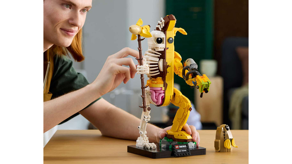 Největší sada kolekce LEGO Fortnite, Peely Bone, je určena pro stavitele ve věku 18 let a starší — starší sourozenci možná rádi povedou stavbu. Sběratelská sada obsahující 1 414 dílků má pohyblivé paže a doplňky jako Peely Pick Krumpáč, Paint Blaster a Banana Bag Batoh.