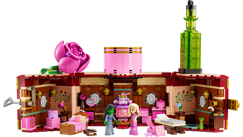 Ačkoli Glinda a Elphaba nejsou nutně nejlepšími přáteli na začátku, děti se určitě stanou nejlepšími přáteli s LEGO Wicked Glinda & Elphaba Kolejní Pokojovou sadou, která obsahuje 740 dílků a tvoří kufr, který po otevření odhalí dívčí kolejní pokoj. Tato sada přichází s QR kódem, který přehraje hudební video.