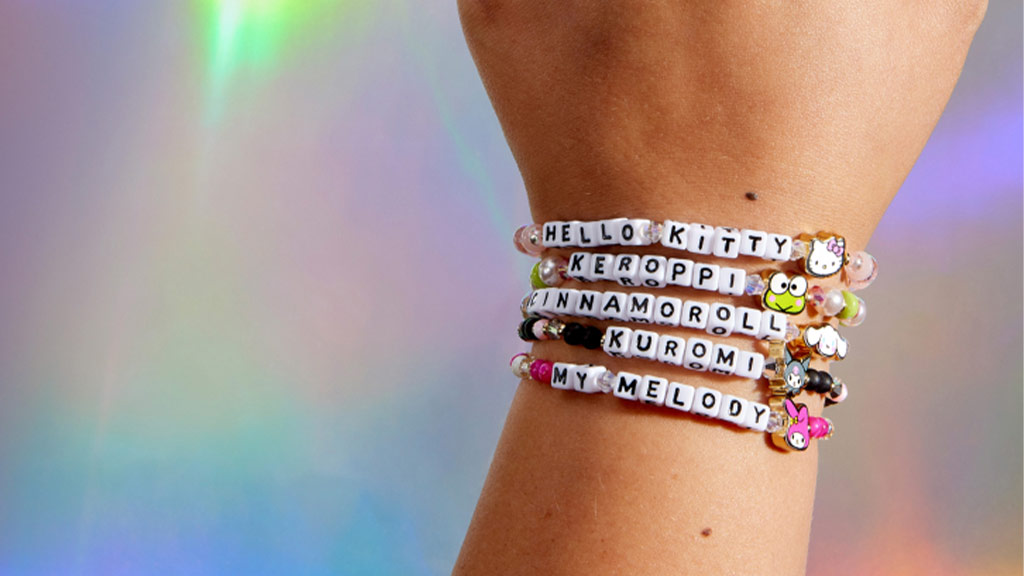 Děti jsou už léta nejlepšími přáteli s Hello Kitty a k 50. výročí postavy mohou děti ukázat, jak silné je toto přátelství. Projekt Little Words přináší do světa laskavost s náramky přátelství, které jsou inspirovány Hello Kitty a jejími přáteli.V nové kolekci je pět různých designů, každý založený na barevném schématu jedné postavy. Kolekce zahrnuje náramek s růžovými a průhlednými korálky pro Hello Kitty; modro-bílý náramek pro Cinnamoroll; zelený, růžový a bílý náramek pro Keroppi; černý, šedý a růžový náramek pro Kuromi; a živě růžový a průhledný náramek pro My Melody.